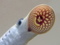 Popis : | Tělo je velmi úzké, ale velmi dlouhé. Hlava je velká, na spodní straně hlavy jsou ústa s přísavkami a hrubým jazykem (viz obrázek). Za hlavou je okolo 7 malých žaberních otvorů. Hřbetní ploutve jsou dvě, obě jsou posunuty dozadu k ploutvi ocasní a obě jsou velmi nízké. Ocasní ploutev je také velmi malá. Řitní ploutev není vyvinuta. Tělo je většinou bělavé s modrým nádechem, může ale být i tmavě hnědé se světlými skvrnami. |