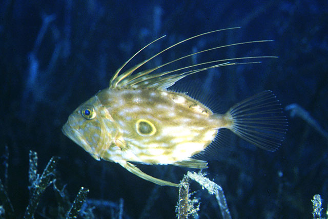 Popis : | Vysoké zploštělé tělo pokryté malými šupinami. Velká hlava, oči jsou umístěny vysoko, ústa jsou velká a směřují šikmo nahoru. Hřbetní ploutve jsou dvě. První má 9 až 10 dlouhých ostnatých paprsků, druhá hřbetní ploutev má 3 až 4 ostnaté a 20 až 23 měkkých ploutevních paprsků. Zadní část těla lemují špičaté kostěné výběžky. Tělo má šedou barvu se žlutými skvrnami nepravidelného tvaru. Na bocích je velká černá skvrna se žlutým lemem. |